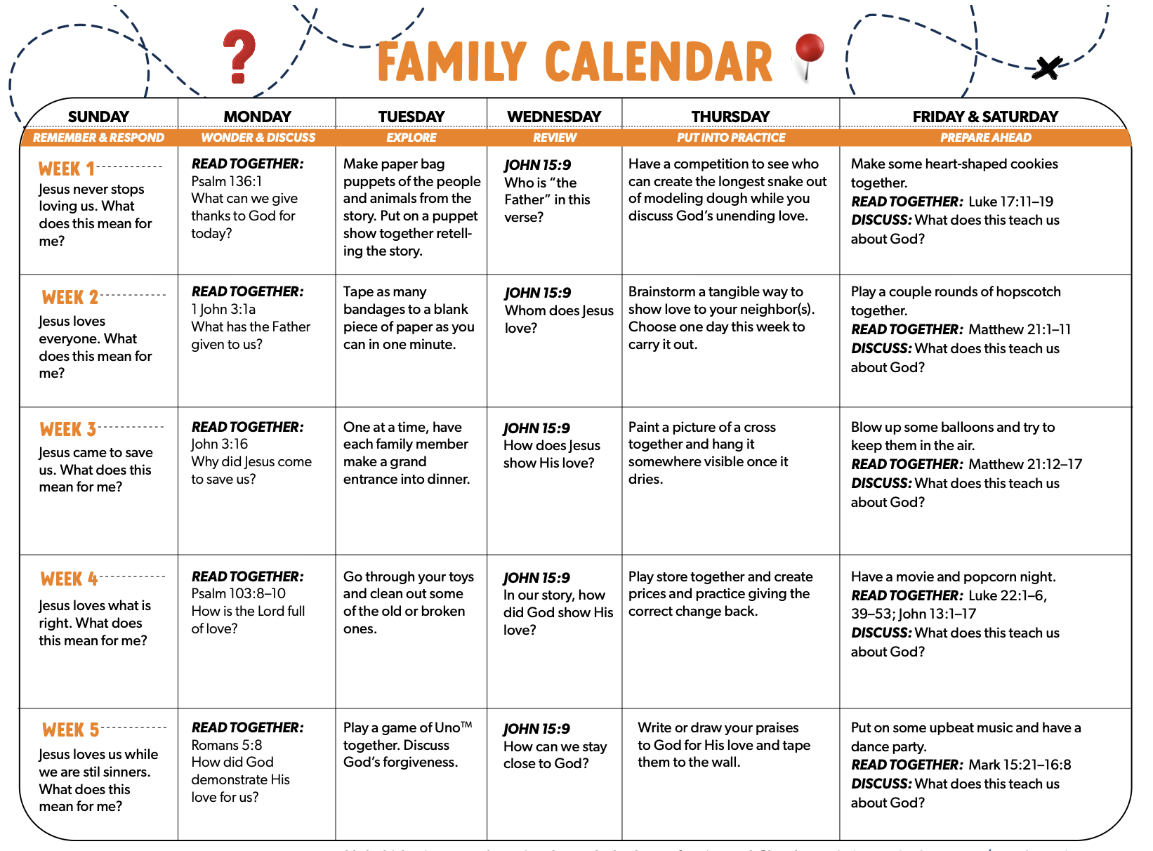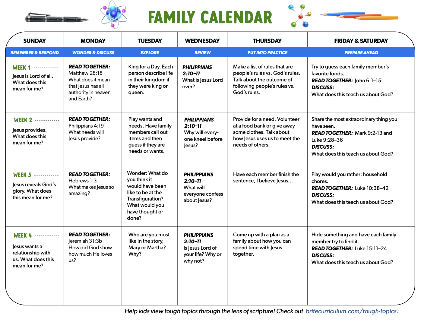 We want to partner with you as you help your kids follow Jesus. Here you’ll find tools and conversation starters to keep the lessons from Sunday alive all week long.